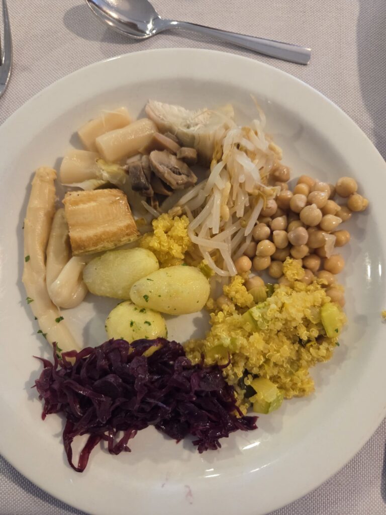 Občas byla i quinoa a vykouzlili cuketové i řepové carpaccio! Sama bych to ochutila výrazněji, ale dle manžela nebyly slané ani vajíčka, natož toto. Ale snaha se cení. Vždy tam také byla naložena cizrna a zeleninové saláty, které jsem musela opravdu pečlivě zkoumat, aby tam nebyly mořské potvory.