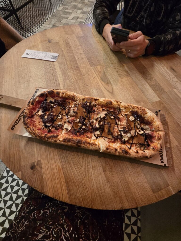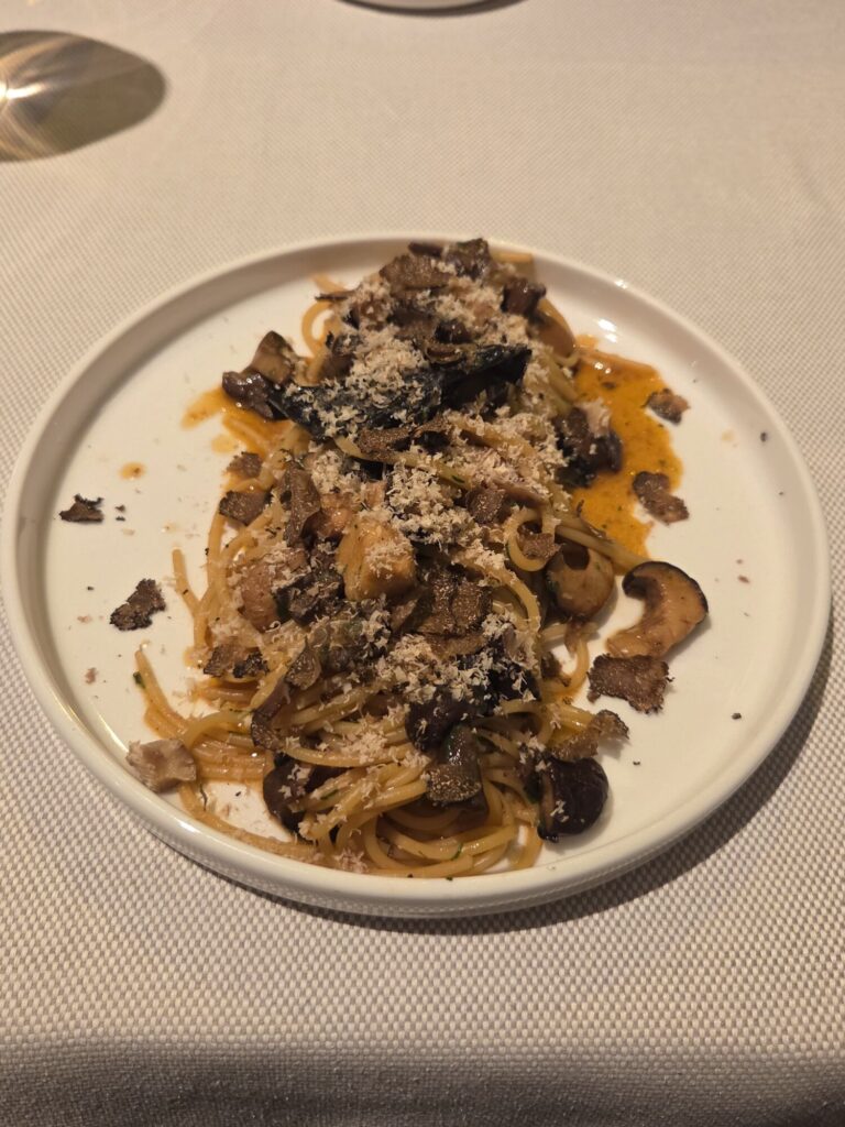 Byli připraveni i na mě jako vegana a bylo to teda něco! Pochutnali jsme si oba dva. Jako předkrm jsem dostala lilek s omáčkou a ořechy, manžel měl tatarák a jako hlavní chod jsem dostala špagety s lanýži a manžel si užil vepřové na houbách s hranolky. K tomu jsme měli vynikající sladké víno, pivo a moc jsme si to užili.