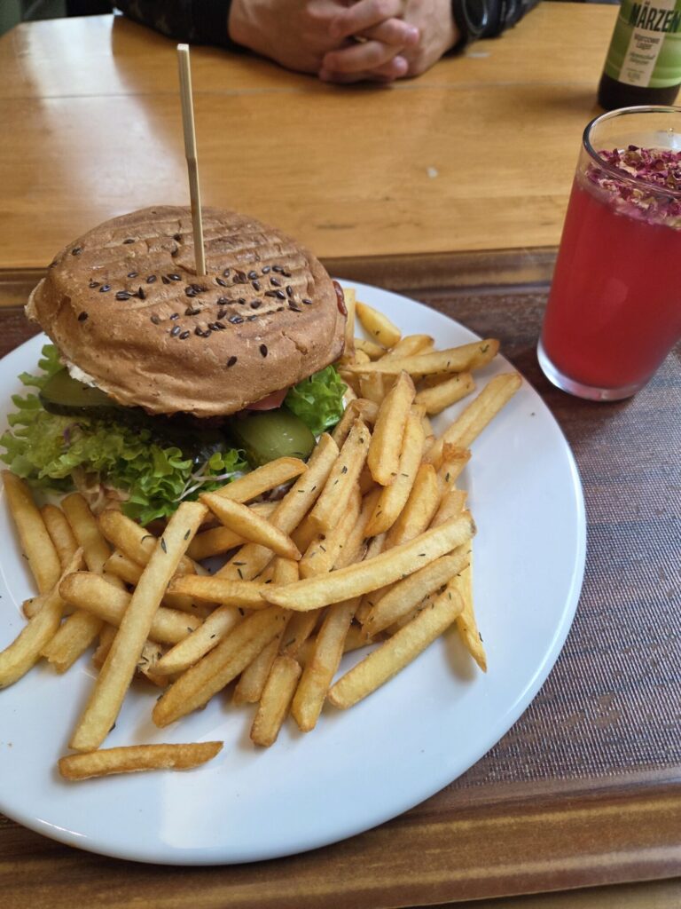 A hned vedle jsem si užila suprový burger s hranolky, manžel si dal klasicky jen pití, ale tím mi chuť nezkazil.